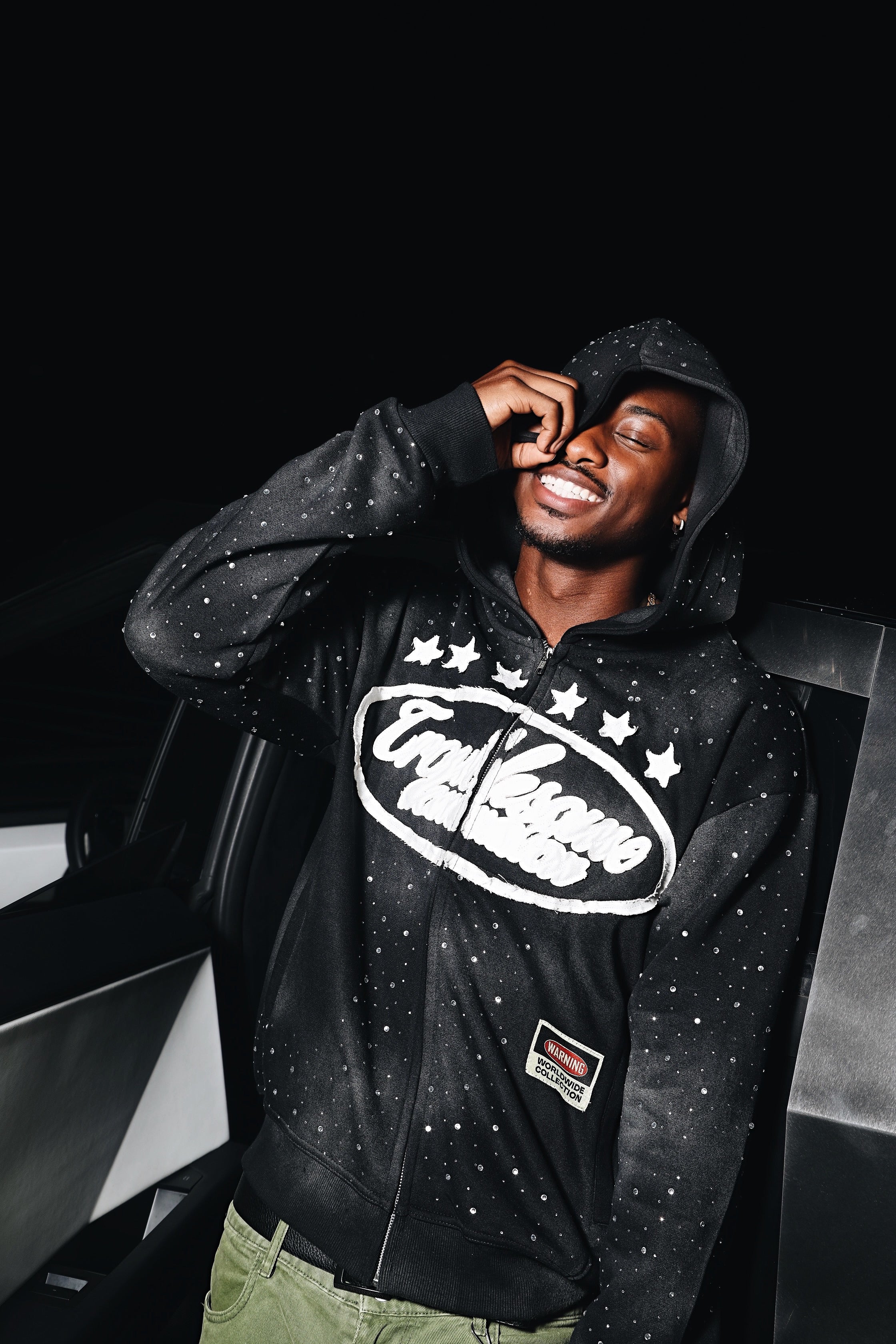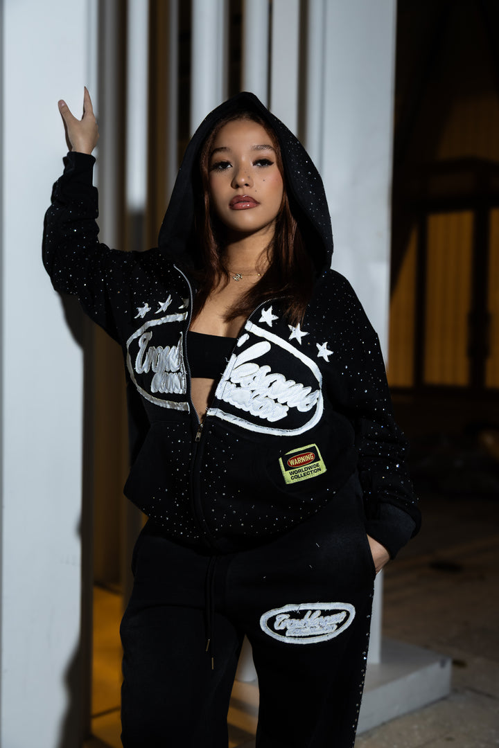 • Details: Acid wash garment, zip up, rhinestones